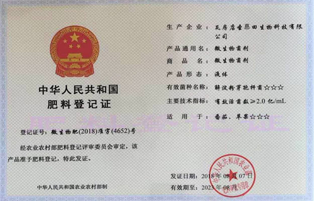 图七:国家农业主管部门颁发的微生物菌剂证明
