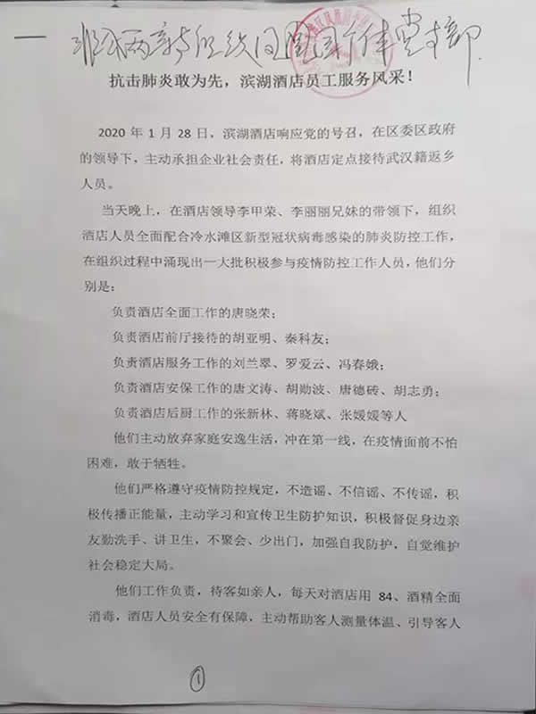 据甄仕荣同志透露,2020年1月28日以来,该党支部成员、团支部书记、滨湖大酒店负责人之一李丽丽同志与其兄李甲荣先生响应党的号召,在区党委、区人民政府领导下,主动接待从武汉返湘人员。他们组织员工,冒着生命危险,热情接待、悉心照料来宾,关键时候为党和国家分忧,为家乡贡献火热的青春,让人深受感动。