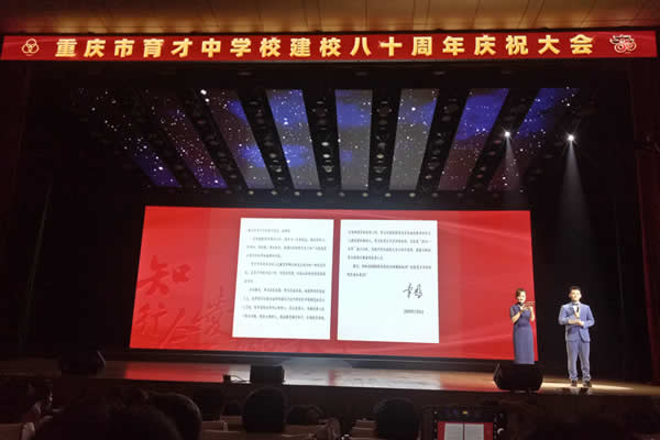 在庆祝大会上,主持人宣读了重庆育才杰出校友、国务院原总理、全国人大常委会原委员长李鹏同志生前发来的贺信以及李鹏同志的女儿、中国陶行知基金会名誉会长李小琳女士发来的贺电。中央相关部委、重庆市有关部门、社会知名人士也发来了贺信,正在海外就读的育才校友代表们还通过视频连线,表达了他们海外学子对母校80华诞的美好祝福。