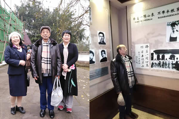 图2:刘友开、陈素珍夫妇应罗春秀老师(左)邀请出席育才校庆,刘友开老师在陶行知先生高足、人民教育家汪达之先生图片前瞻仰