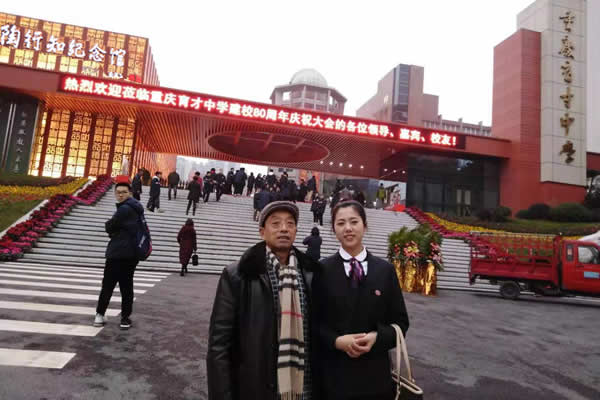 1230日上午11时许,当我们走下飞机来到重庆江北国际机场 T2出口处时,便见到了杨秋兰老师手举着一块写有“重庆育才中学80周年校庆接机处”的红底白字标牌,在迎接我们。杨老师十分热情地接待我们在入住的酒店安顿和用餐之后,便领着我们来到了距住所不远处的庆典现场——重庆市九龙坡区的育才中学本部。