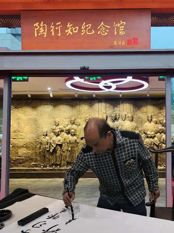 在育才中学陶行知纪念馆”,应工作人员和参观者的邀请,我还为他们书写了学陶师陶的字幅。参观育才中学陶行知纪念馆之后,校庆组委会还安排了我们部分参会者,驱车专程到座落在合川县凤凰山上古圣寺的育才学校原址及那里的“陶行知先生纪念馆”参观考察。