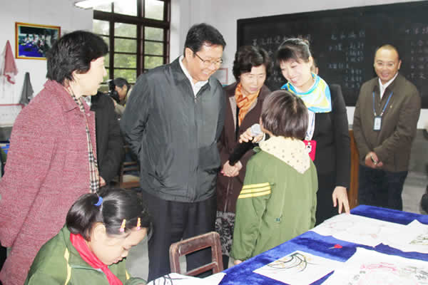 图九:全国教育工作现场会上,重庆市合川区育才学校的孩子们在向时任教育部副部长刘利民、全国妇联书记处书记赵东花介绍托管教育开展情况