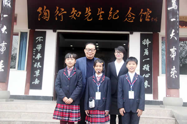 图11:国家教育咨询委员、国家总督学顾问陶西平与育才学校校长沈小燕及导游小先生合影