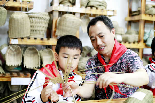图六:育才学校老师手把手教学生制作竹编农具(非遗传承)