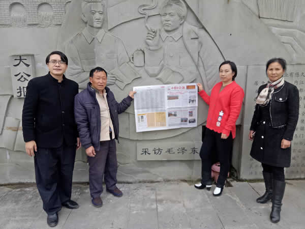 图三:唐良闻、陈辉与内江村民苏全芳、毛主席红卫兵黄富才手持《中国日记报》在毛主席与范长江雕像前合影 (左起:《毛泽东颂》诗歌作者唐良闻<字开元,笔名马义豪>、毛主席红卫兵黄富才、内江村民苏全芳、苏州巾帼陈辉)